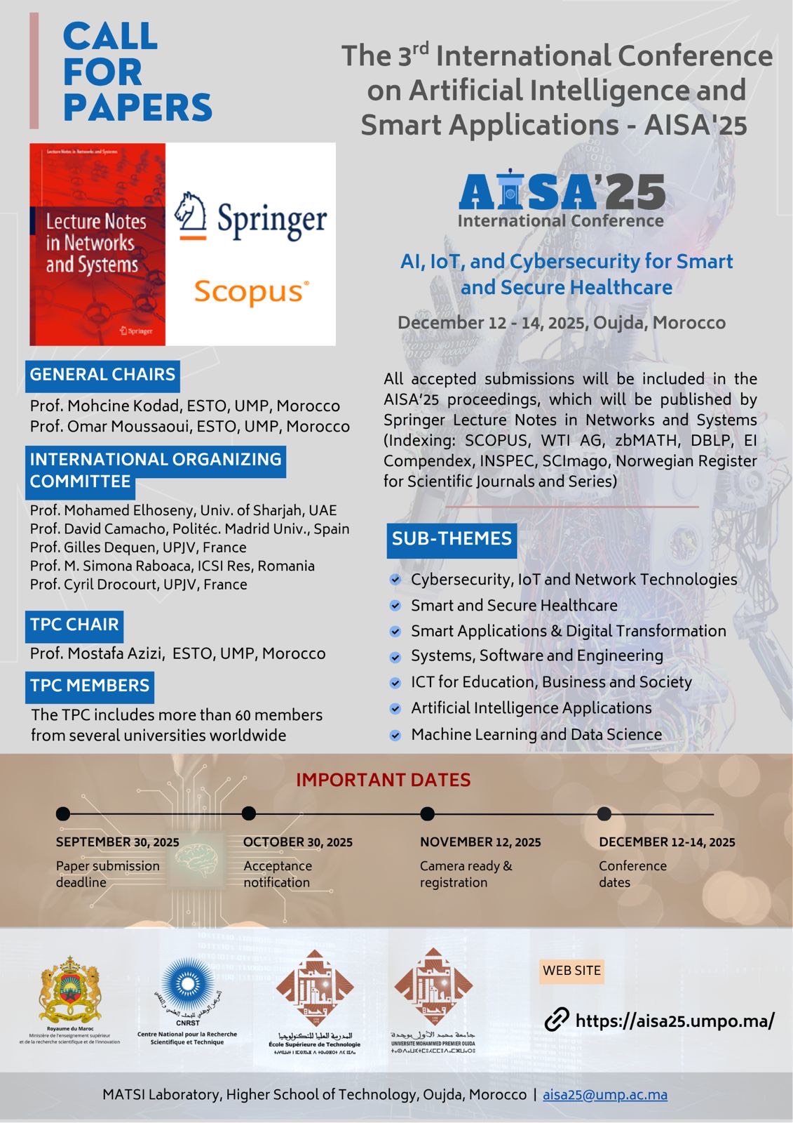 The 3rd International Conference on Artificial Intelligence and Smart Applications (AISA'25) under the theme: AI, IoT, and Cybersecurity for Smart and Secure Healthcare is organized by Mohammed First University, Higher School of Technology - Oujda, MATSI Laboratory and AISA Association. This prestigious conference will be held from December 12 to 14, 2025, in Oujda, Morocco. AISA'25 aims to bring together a wide range of participants, including PhD students, researchers, engineers, professionals, academics, institutional representatives, industry leaders, and other experts. The event offers a unique platform for participants to exchange ideas, discuss emerging trends, and share their knowledge and experience in the fields of artificial intelligence, smart applications, and intelligent technologies. Since its inception in 2021, the AISA conference has established itself as a high-level international event, attracting renowned scholars, world-class researchers, and leading specialists from around the globe. The first edition took place in 2021, followed by a successful second edition in 2023, both of which consistently gathered an international audience and provided a privileged space for scientific discussion and collaboration. This upcoming edition, AISA'25, seeks to build on this momentum by inviting national and international researchers to present their most recent work, exchange scientific experiences, and share their insights in the rapidly evolving domains of artificial intelligence and smart technologies. Moreover, the conference will offer a valuable opportunity for young researchers, PhD students, and recent graduates to connect with experienced professionals and experts from various disciplines. Through this interaction, participants will be able to present their research findings, expand their professional networks, and engage in fruitful discussions on the challenges and innovations shaping the future of artificial intelligence and smart systems.